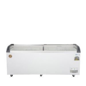 Conservadora Vidrio Semicurvo 695 Litros con triple función: refrigerado, congelado suave y ultra. Incluye 7 canastos, iluminación LED, termostato digital y 2 puertas deslizables de vidrio semicurvo.