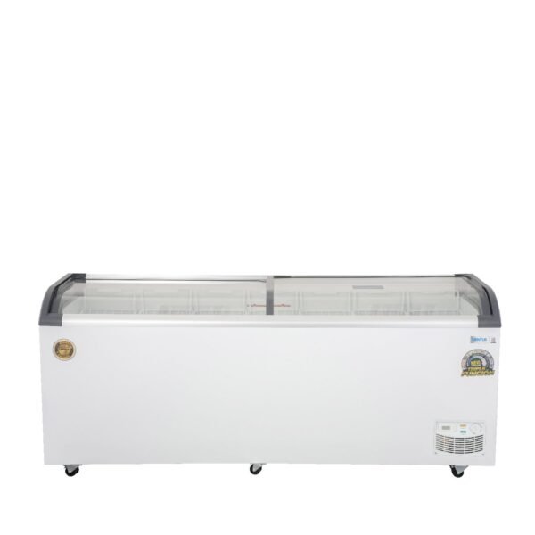 Su estructura combina alto rendimiento con un diseño visual atractivo, destacando por sus 2 puertas deslizables de vidrio semicurvo, que permiten una exhibición clara y elegante del contenido.