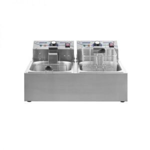 Equipada con dos depósitos independientes de 6 litros cada uno, permite freír distintos productos al mismo tiempo sin mezclar sabores, lo que la hace ideal para fuentes de soda, cafeterías, cocinas industriales, food trucks y locales de comida rápida.